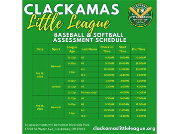 Please check out the attached Clackamas Little League Baseball and Softball Assessment Schedules for 2026 and let us know if you have any questions. Please reach out if you need any assistance and we would be happy to help.